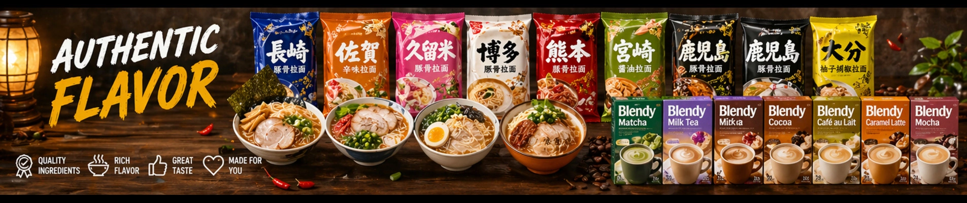 Instant noodles and pantry essentials.